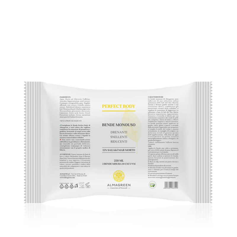 Le bende possono essere applicate su gambe, cosce, glutei e pancia a seconda della necessità. Alla fine di ogni trattamento la pelle risulta meravigliosamente tonica e levigata e le gambe più leggere. Consigliamo le Bende Perfect Body di Almagreen a tutti coloro che vogliono combattere la sensazione di pesantezza e gonfiore, lavorando al tempo stesso sulla buccia d’arancia e sulla ritenzione idrica. Un ottimo alleato contro i liquidi in eccesso e contro l’odiata cellulite!
